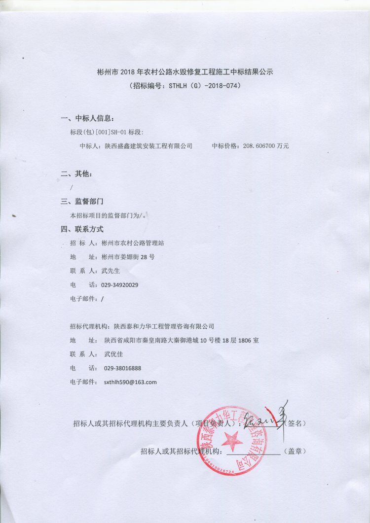 彬州市2018年农村公路水毁修复工程施工中标结果公示