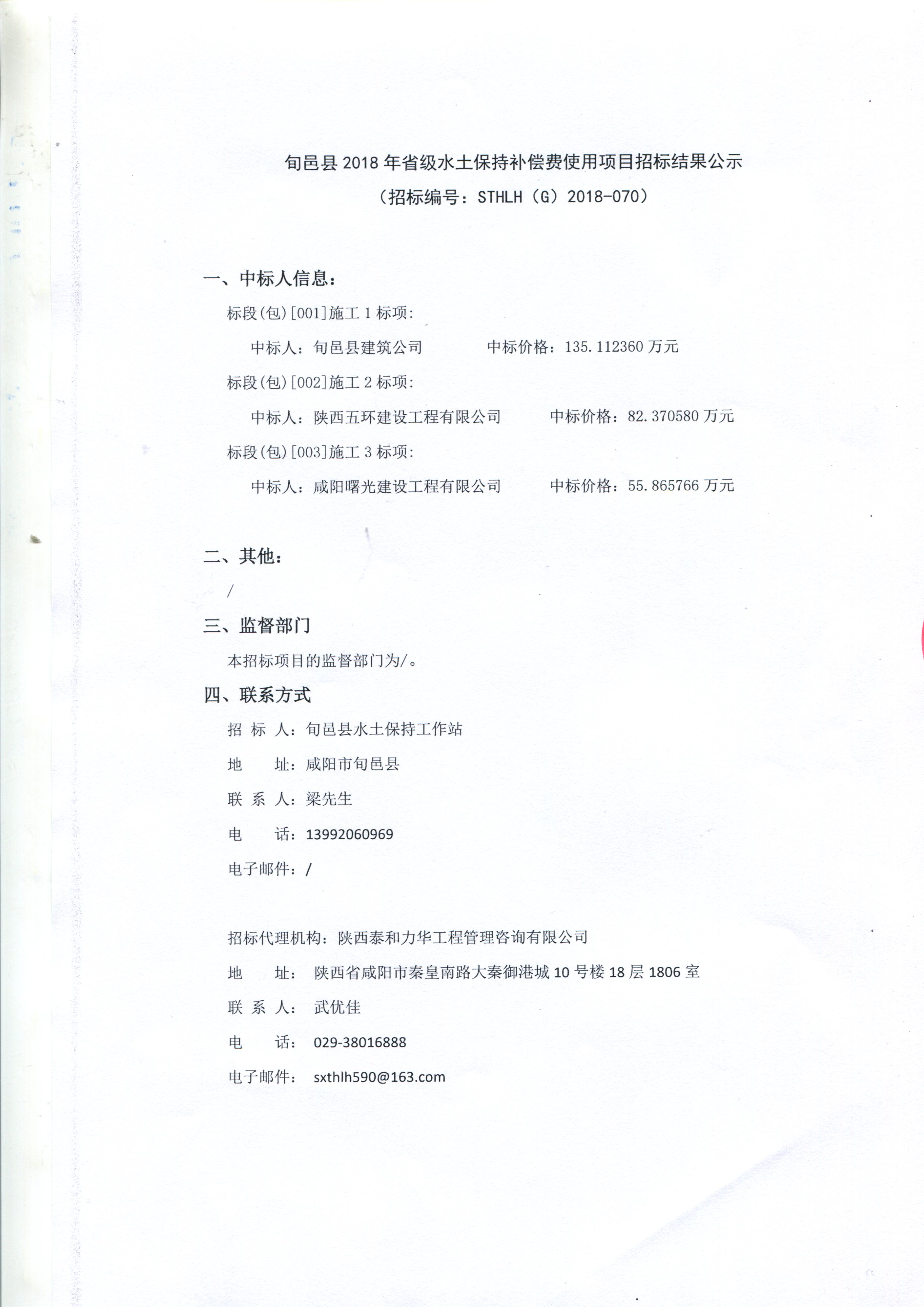 旬邑县2018年省级水土保持补偿费使用项目招标结果公示