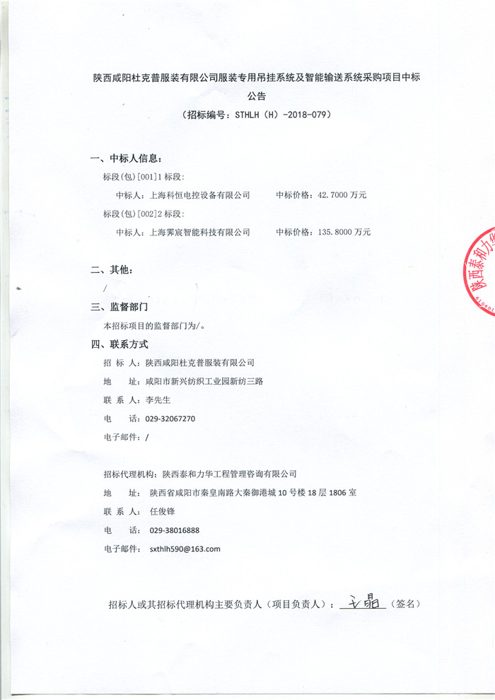 陕西咸阳杜克普服装有限公司服装专用吊挂系统及智能输送系统采购项目中标公告