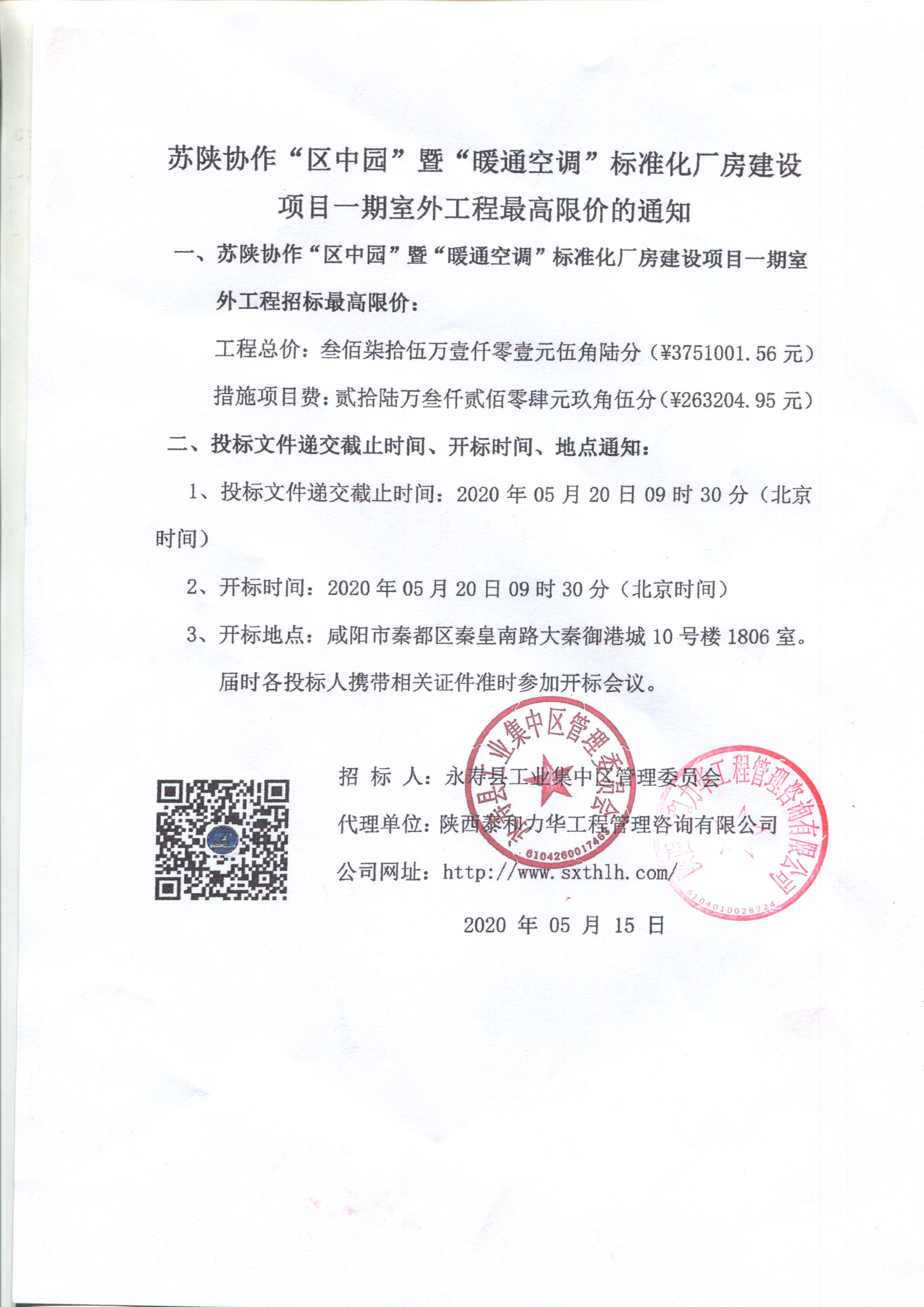 苏陕协作“区中园”暨“暖通空调”标准化厂房建设项目一期室外工程最高限价的通知