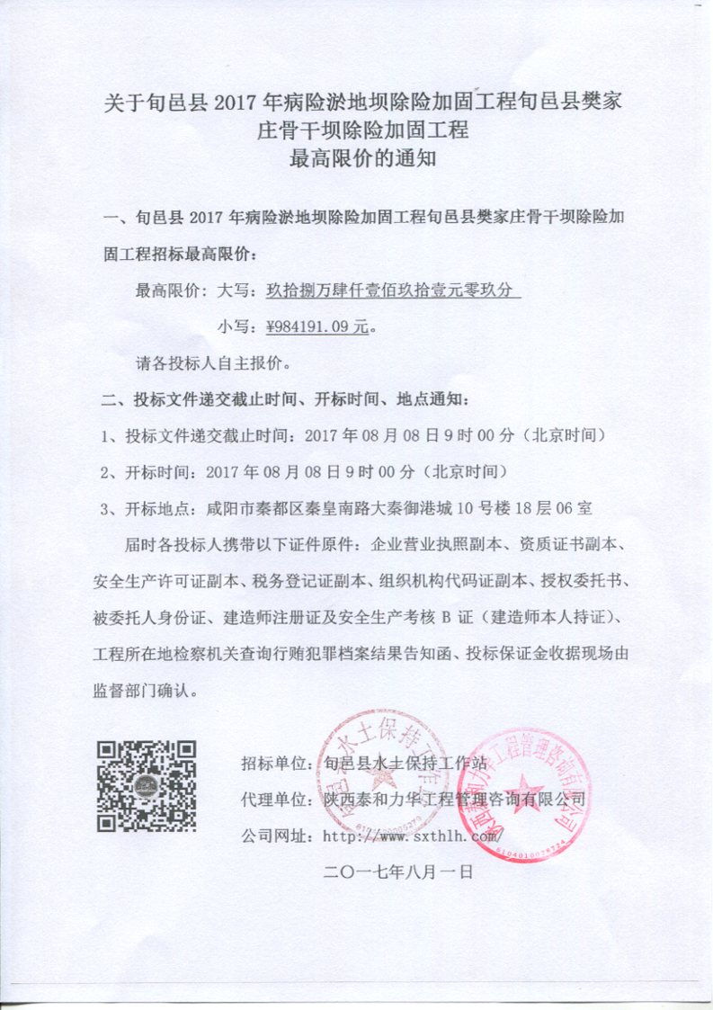 旬邑县2017年病险淤地坝除险加固工程旬邑县樊家庄骨干坝除险加固工程