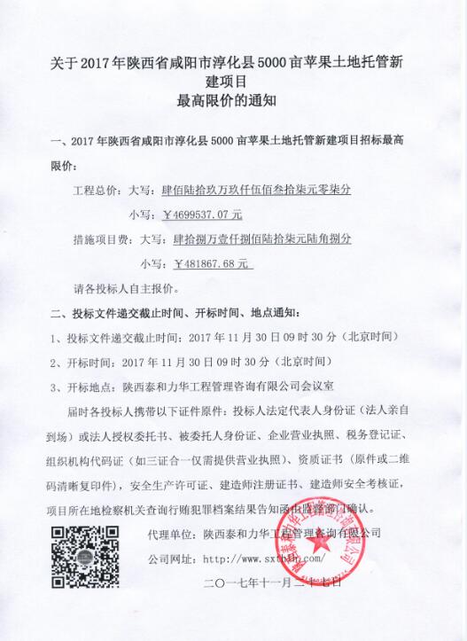 关于2017年陕西省咸阳市淳化县5000亩苹果土地托管新建项目最高限价的通知