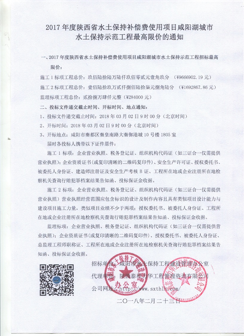 2017年度陕西省水土保持补偿费使用项目咸阳湖城市水土保持示范工程最高限价