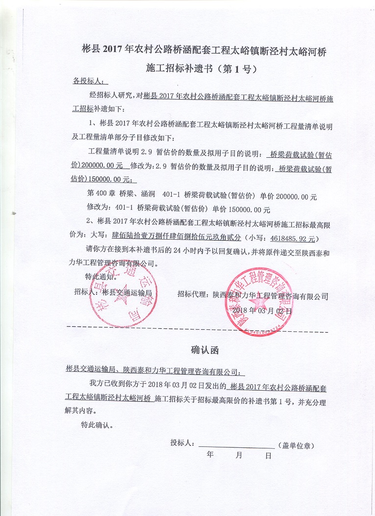 彬县2017年农村公路桥涵配套工程太峪镇断泾村 太峪河桥施工招标补遗书