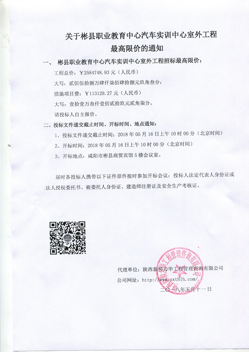 关于彬县职业教育中心汽车实训室外工程最高限价的通知