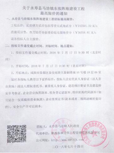 关于永寿县马坊镇东张阵地建设工程最高限价的通知