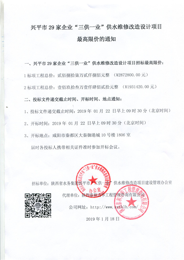 兴平市29家企业“三供一业”供水维修改造设计项目最高限价的通知