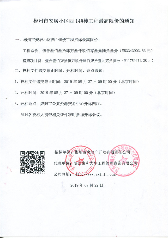 彬州市安居小区西14#楼工程最高限价的通知