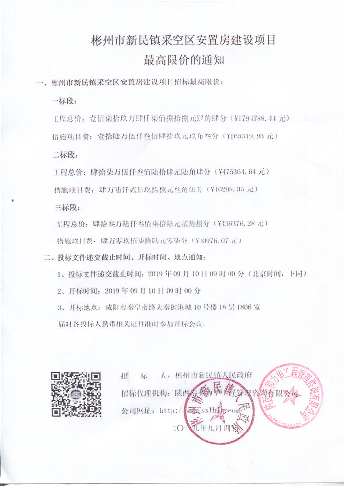 彬州市新民镇采空区安置房建设项目最高限价的通知