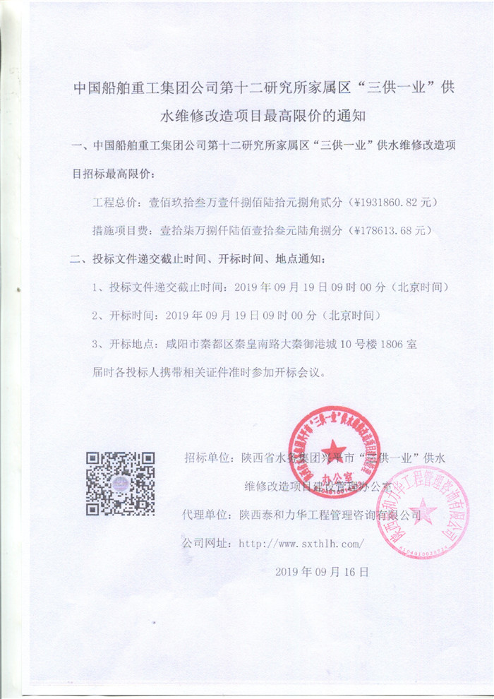 中国船舶重工集团公司第十二研究所家属区“三供一业”供水维修改造项目最高限价的通知