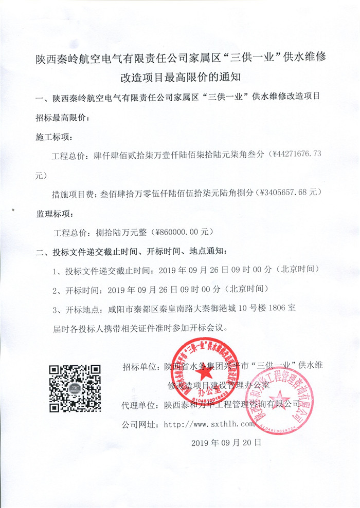 陕西秦岭航空电气有限责任公司家属区“三供一业”供水维修改造项目最高限价的通知