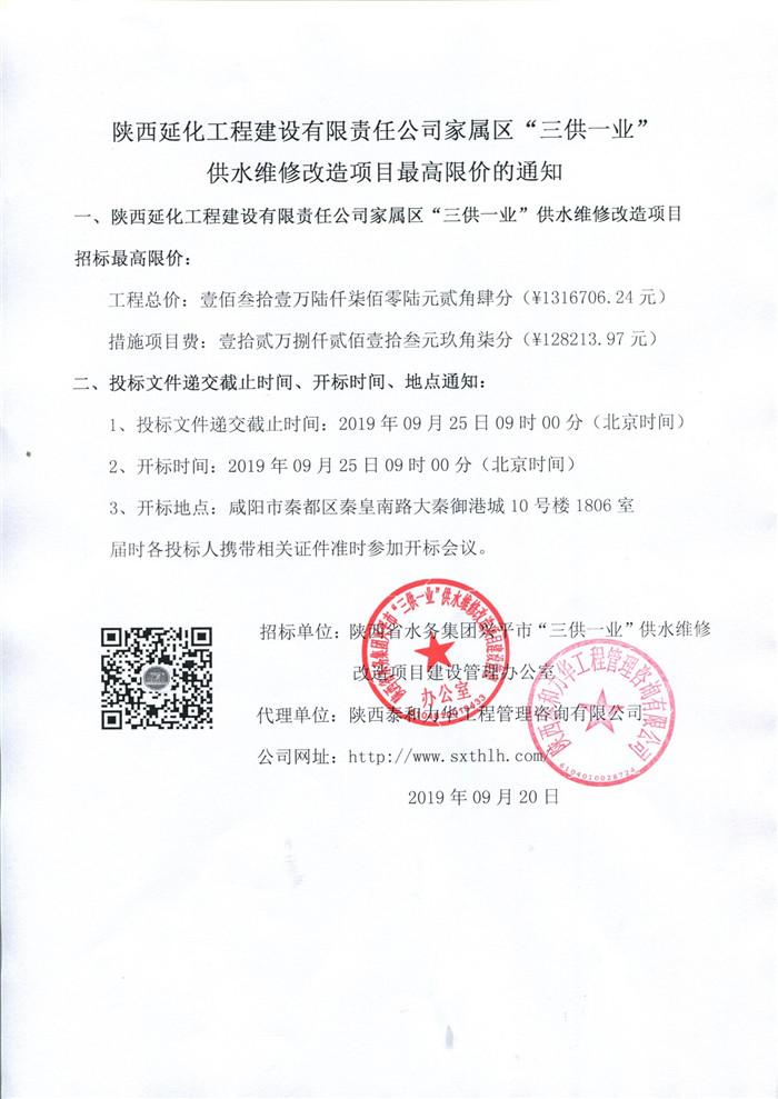 陕西延化工程建设有限责任公司家属区“三供一业”供水维修改造项目最高限价的通知