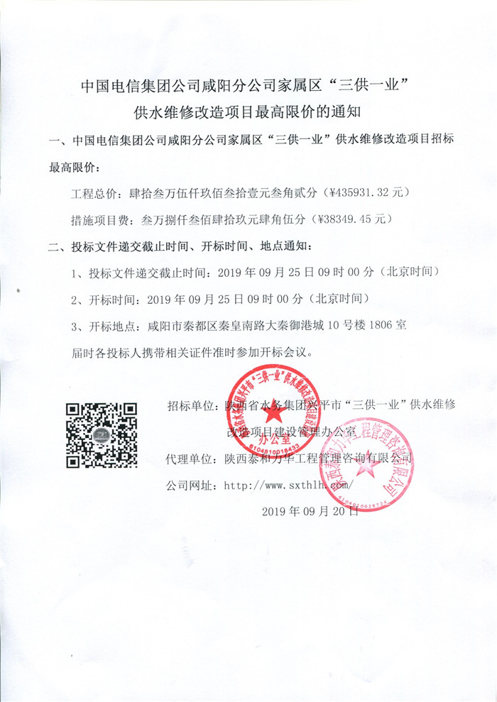 中国电信集团公司咸阳分公司家属区“三供一业”供水维修改造项目最高限价的通知