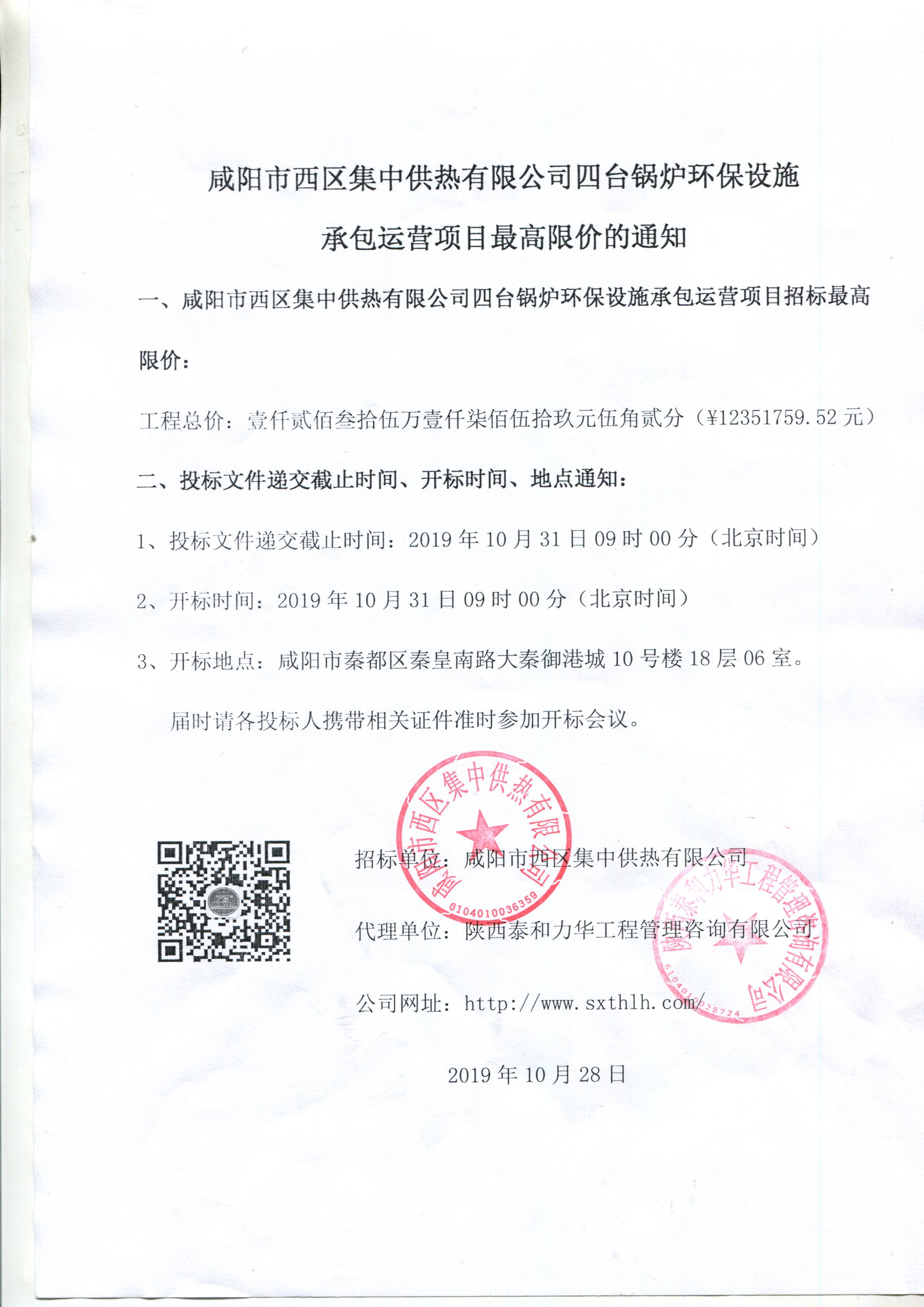 咸阳市西区集中供热有限公司四台锅炉环保设施承包运营项目最高限价的通知